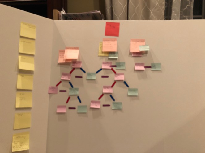 I’ve been working on a multi-generational story that spans almost 100 years. To help me keep track of who-did-what, and how the pieces fit together, I’ve resorted to old-school storyboarding to track my characters.
